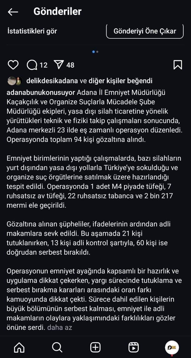 “Adana İl Emniyet Müdürlüğü Kaçakçılık ve Organize Suçlarla Mücadele Şube Müdürlüğü ekipleri, yasadışı silah ticaretine yönelik yürüttükleri teknik ve fiziki takip çalışmaları sonucunda, Adana merkezli 23 ilde eş zamanlı operasyon düzenledi. Operasyonda toplam 94 kişi gözaltına alındı.